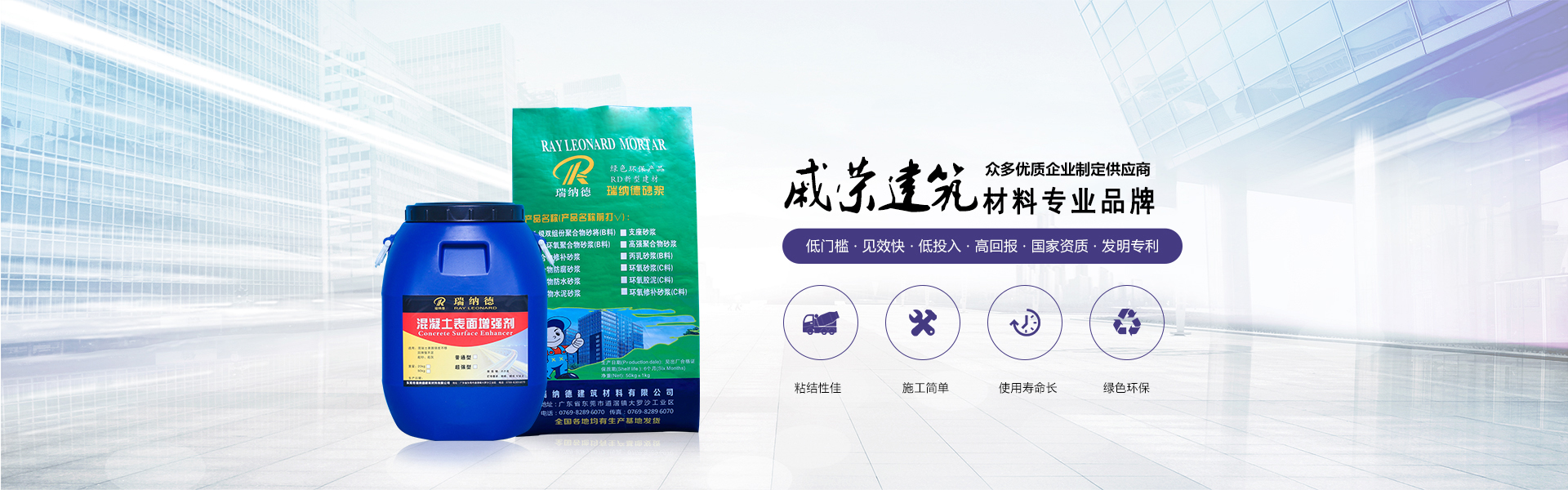 東莞市戚榮建筑材料有限公司是東莞市瑞納德建筑材料有限公司旗下子公司,是一家集研發、生產、銷售、技術服務為一體的技術型企業,,并通過ISO9001:2000質量管理體系及ISO14001:2004環境管理體系世界標準認證?,F已在廣東、浙江、北京、河南鄭州、沈陽、重慶等均有生產基地。